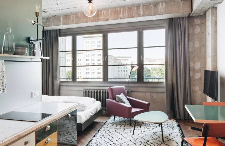 Fully functional and fully equipped kitchenette in the Neon Silver apartments at Berlin Frankfurter Tor.
